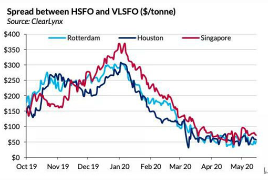 吉布森指出:“在近期的公开声明中,船东并没有提到燃油价格的大幅下降以及船用低硫燃料油和高硫燃料油之间的价差收缩。疫情导致石油需求暴跌,3-4月两种燃油的价差跌至50-60美元/吨,而1月的价差约为275-300美元/吨,导致配备脱硫塔的船舶即期收益大幅下降。以TD3C航线为例,4月份装有脱硫塔的VLCC平均收益仅比未装脱硫塔的油轮高出4000美元/天。而几个月前该数字高达16000美元/天。”