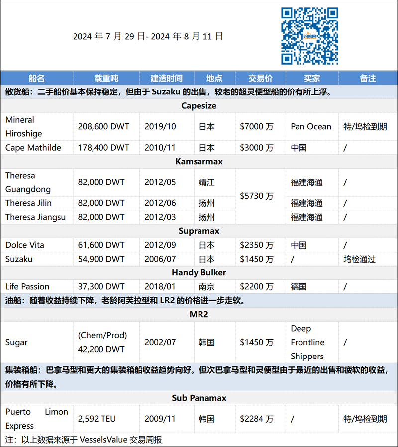 本期报告海岬型Cape Mathilde(2010年日本造178,400 DWT)交易价3000万美元,价格较年中和年初基本无变化。
