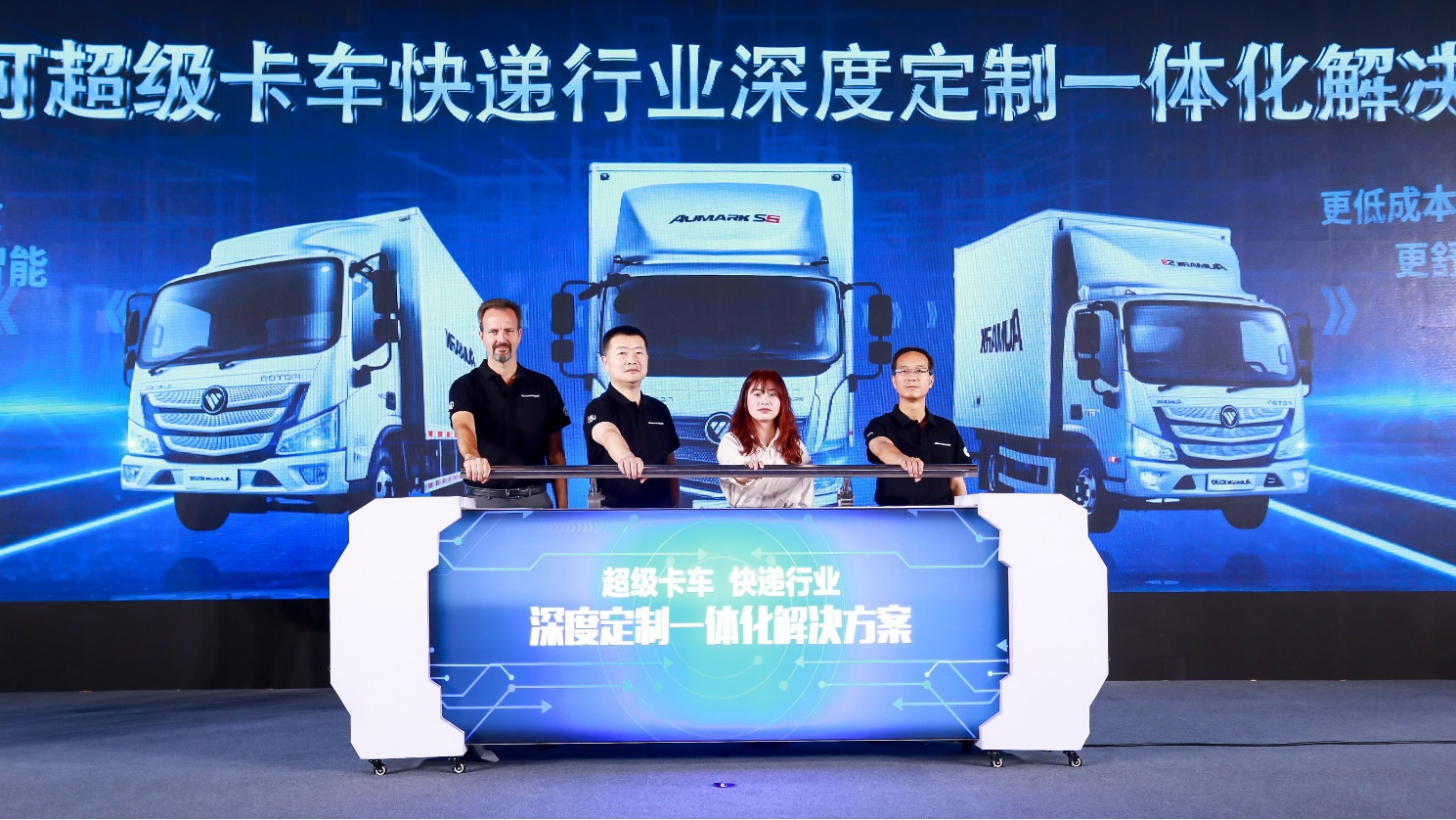 【浙江省快递协会副秘书长周琰、福田汽车集团副总裁、欧马可事业部总裁顾德华、北京福田康明斯发动机有限公司工厂厂长 Miguelkindler、福田采埃孚嘉兴投资公司总经理蓝红共同发布快递行业深度定制一体化解决方案】