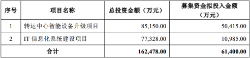 根据德邦快递披露的信息,转运中心智能设备升级项目及IT信息化系统建设项目的总投资金额预计16.2亿元,拟通过非公开发行股票募集的资金规模为6.14亿元,占项目总额的37.9%。