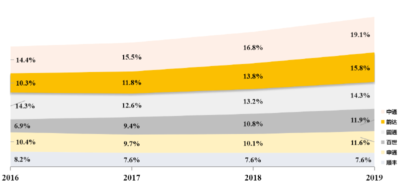 ▲2016--2019快递行业市场份额CR6分布