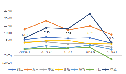 我们对比了六大民营快递公司2019年至2020年第一季度的业绩情况,从中可以发现,顺丰在疫情影响下业务几乎没有遭受冲击,而韵达在一季度的营业收入下降比例达到了45%,主打“大件快运”的德邦营业收入较2019年四季度下降了40%,是这几家公司中下降幅度最小的,同样印证了高端快件市场的承压能力。