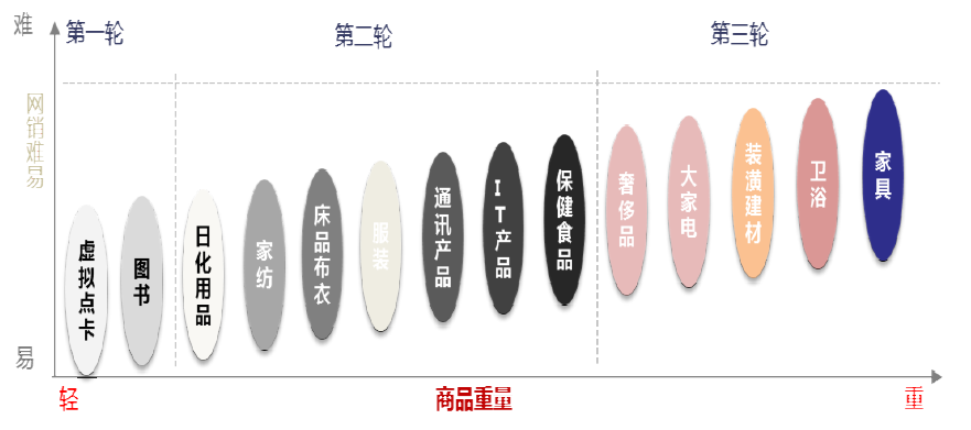 电商起步阶段主要依靠价值低、货物体积小的商品,而随着电商的逐步成熟和快递行业的迅猛发展,高价值、体积大、非标准化外形的商品迎来了发展机遇。据天猫2019年“双十一”数据显示,本次共有103个家具家电品牌进入“亿元俱乐部”,同比增加24.10%,占“亿元俱乐部”品牌总数的34.45%。