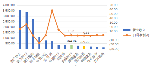 ▲2019年物流行业上市公司营业收入及归母净利润