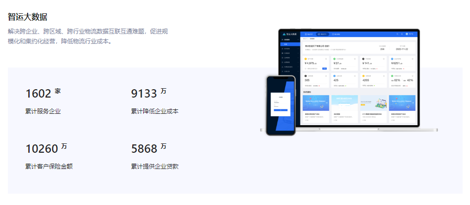 智运大数据平台(zy.zone),融合了国内千万辆货车高速行驶数据、轨迹数据、实时北斗+GPS数据、保险数据、路政数据、车辆诚信记录等数据,通过数据校验和算力分析代替人工核查核算,降低企业经营风险,实现了为物流企业减负增效率,解决了物流行业诚信经营、数据核验、经营成本高、业务流转效率低等痛点。同时,利用互联网技术并结合网络货运平台模式,为物流行业解决资金结算、票据合规、供应链金融、应收账款质押等经营融资难题。
