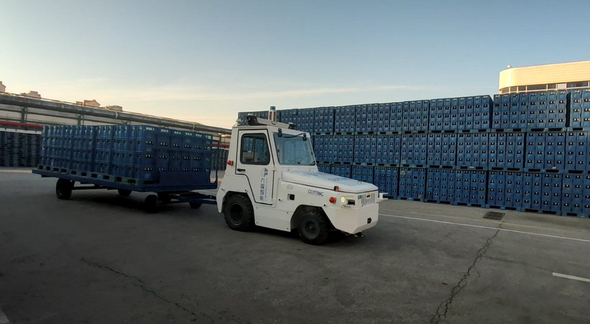 在3年的奋进过程中,九曜智能团队深入实际业务场景调研,不断完善技术及产品,得到了行业客户的高度肯定。 机场行业应用 在货运机场场景中,九曜智能机场机坪无人驾驶解决方案的应用,满足装卸机全流程无人化作业需求,其中Q300型无人驾驶牵引车可实现机坪内多车甩挂作业,且关键作业点精度及稳定性优于人工作业。