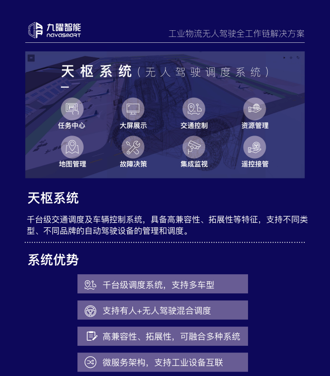 天枢系统:千台级交通调度及车辆控制系统,具备高兼容性、拓展性等特征,支持不同类型、不同品牌的自动驾驶设备的管理和调度。
