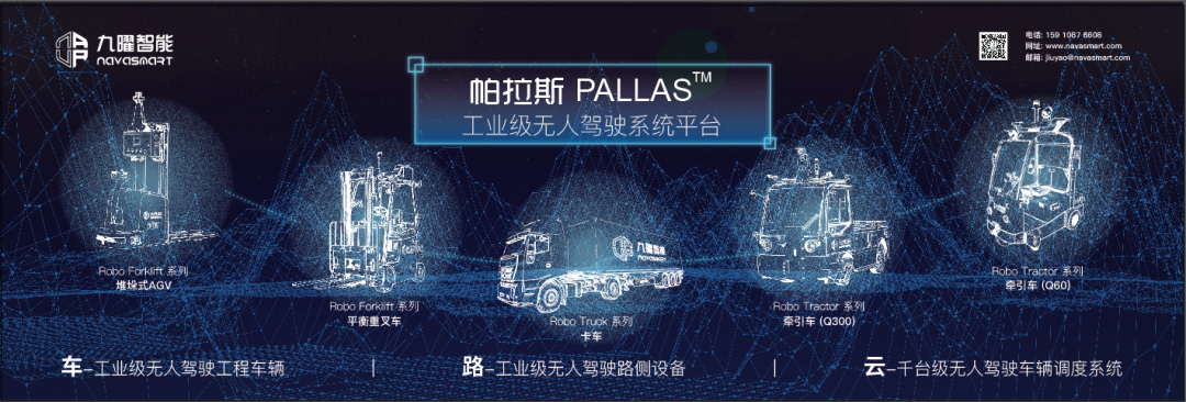 工业物流无人驾驶全工作链解决方案的核心是九曜智能自主研发的“帕拉斯(PALLASTM)无人驾驶系统平台”,主要由车(工业级无人驾驶工程车辆)、路(工业级无人驾驶路侧设备)、云(千台级无人驾驶车辆调度系统)三部分组成。