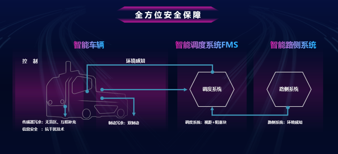 ·多维度安全策略,保驾护航 安全保障主要通过单车智能、调度系统、路侧系统实现,达成三位一体的全方位安全保障。在单车智能方面,我们配置了超声波+毫米波+激光雷达的三重安全防护,可实现平面360°及3D全范围无死角安全检测。在调度系统方面,通过视距+阻塞块的方案,保障集群调度中的交通安全。同时,基于路侧系统,通过对环境的感知来辅助无人驾驶车辆进行驾驶决策。