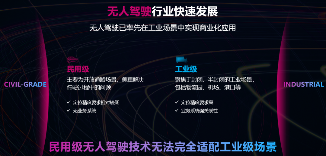 10月26日,CeMAT 2021将于上海新国际博览中心召开,九曜智能将携工业物流无人驾驶全工作链解决方案重磅亮相! 自2018年成立以来,九曜智能致力于封闭、半封闭园区工业级无人驾驶技术研究,目前已具备多品类工业无人车辆的研发及改装能力,拥有完全自主知识产权的智能物流业务管理平台(天机系统)及无人驾驶调度系统(天枢系统),在自动脱挂钩、高精度自适应对位等技术领域已完成专利布局,同时,在众多合作伙伴的支持下完成多行业项目落地,真正实现了“仓储+装卸+运输”工作链无人化应用,助力企业实现供应链智能化的战略转型,为国家“双碳”目标达成提供支撑。 相较于民用技术,工业级无人驾驶技术聚焦于封闭、半封闭的工业场景,定位精度要求更高,业务系统强关联性更强,民用级无人驾驶技术无法完全适配工业级场景。