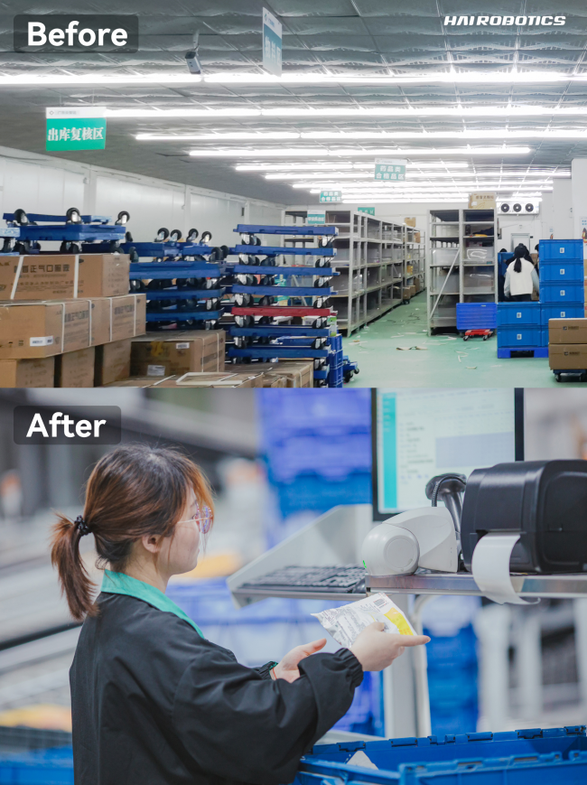 海柔创新一直秉持为客户创造价值的理念,以专业态度与客户共同攻克效率难题。从“人找货”升级到“货到人”时,尤其需要保证订单高峰下几十台机器人的高效调度。项目工程师需要在机器人和IWMS、ESS系统之间进行有效对接,通过巧妙设置多机路径规划、智能选择最优路径,才能有效缓解拥堵、等待及锁死等情况 。 此外,HAIPORT装卸机一边对接机器人拣选区、一边对接分拣区和人工工作站,需要配合上下游输送线,达到3秒上料箱,5秒卸料箱的速度。面对紧张的效率任务,项目工程师也在根据客户的要求持续调试,努力达到最佳状态。