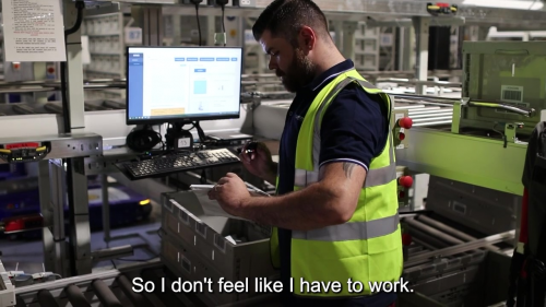 △ 万邑通英国仓库 改善后的工作方式 在万邑通英国仓的库房里,来自英国的仓库拣选员CC(英文简称)也正在遵循电脑屏幕指令操作分拣取物,“有100台机器人在高效率的给我们搬运箱子。”CC在谈及工作时依然掩藏不住兴奋,“永远有机器人在等待着我们拣选。”