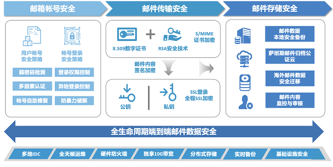 网易企业邮箱在安全技术领域一直独占鳌头,是国内首家获准EAL3+级安全证书的邮件服务商,具有严格完善的安全防卫体系,包括网络安全、帐号安全、传输安全、运维安全、数据安全、操作安全等全景能力,保障企业邮件信息安全无忧。同时,集成反垃圾、反钓鱼、反病毒邮件的能力,对恶意邮件攻击进行精准识别和隔离,通过收发信策略管控、全自动化风险过滤、智能化算法识别,保证邮件在数据生成、传输、存储、运营全生命周期各个环节的安全可控。