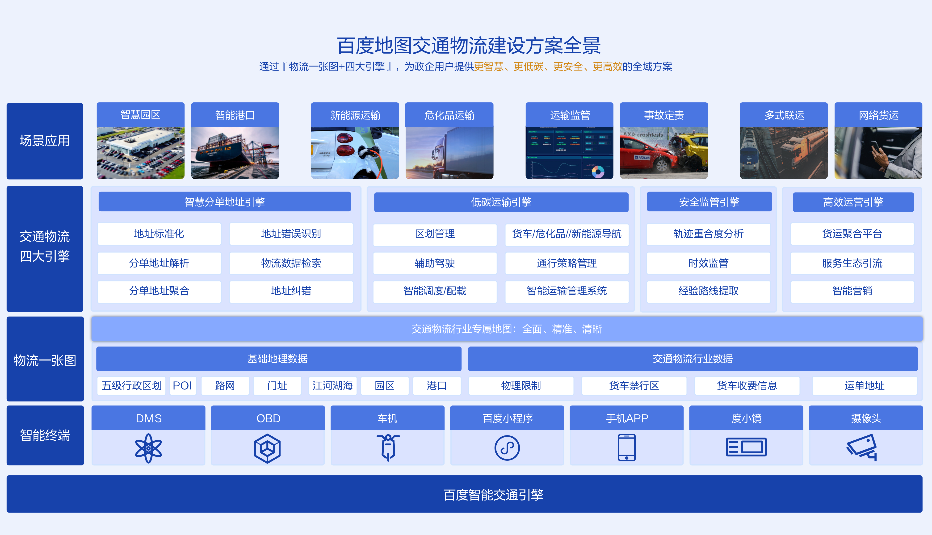 在自研AI技术加持下,百度地图交通物流建设方案构造了智慧分单地址引擎、低碳运输引擎、安全监管引擎、高效运营引擎在内的四大数字化服务引擎。