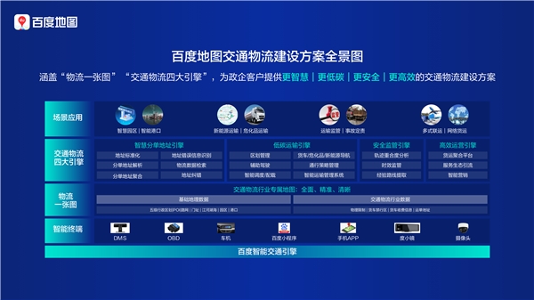 为此,百度地图基于百度在AI及大模型深耕多年的技术优势,提出百度地图“交通物流建设方案”, 利用物流地理要素和业务要素的全面接入,充分发挥百度在物流地理位置、道路通行情况的理解优势、空间计算优势、数据洞察优势与人工智能优势,通过智慧分单与地址解析引擎、低碳运输引擎、安全监管引擎、高效运营引擎打造交通物流的基础设施,来更好的通过底层能力的打造服务千行百业,促进产业变革,驱动价值再造。