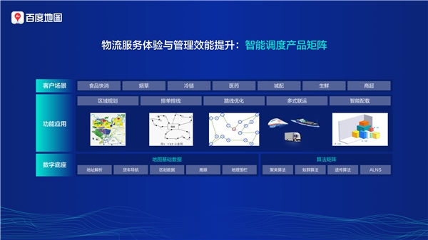 以百度地图智能调度功能为例,通过深入物流业务场景,专为物流行业打造的特色地图服务,可实时监测车辆位置和路况,以及处理货物的需求、调度车辆等综合信息来实现货物的高效配送,进而提高企业运营效率、降低运营成本、改善运营人员体验。