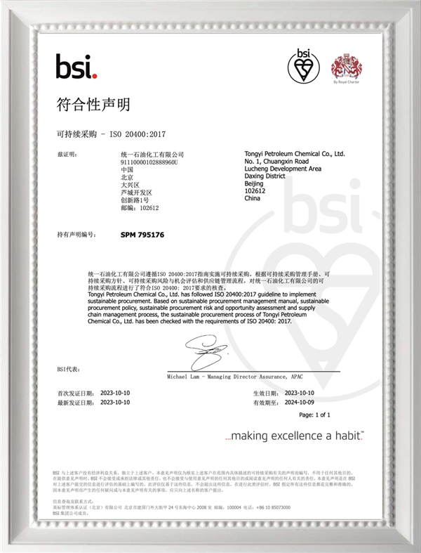 立竿见影的是,统一石化在获取ISO20400认证的同期,在某家全球企业最近的一项招标中,统一石化凭借完整的可持续采购体系以及清晰的碳中和管理体系这套独特优势的组合体系超越老牌外企、大型央企等最终胜出。对此,相关人士认为,该项认证不仅可以减少业务风险、监测和改善供应商的可持续绩效,建立长期可靠的供应商关系,更能获取下游客户更高标准级别采购要求的认同,最终为股东创造价值。