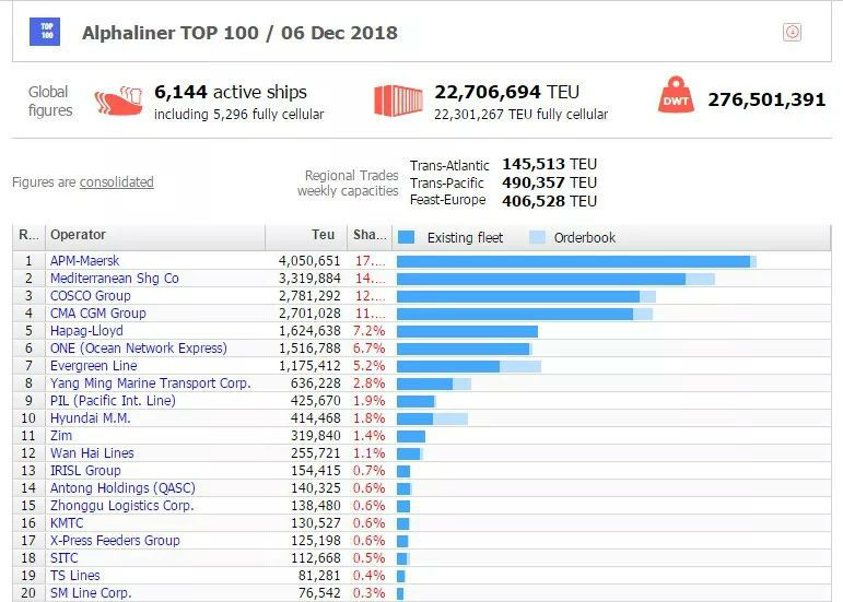 根据Alphaliner最新运力数据显示,截至2018年12月6日,全球二十大集装箱船公司运力排名如下,位列排行榜第一至第十分别是:马士基(第1)、地中海航运(第2)、中远海运集运(第3)、达飞轮船(第4)、赫伯罗特(第5)、ONE(第6)、长荣海运(第7)、阳明海运(第8)、太平船务(第9)、现代商船(第10)。据了解,全球排名前十的班轮公司运力占全球100大集装箱班轮公司的82.1%。