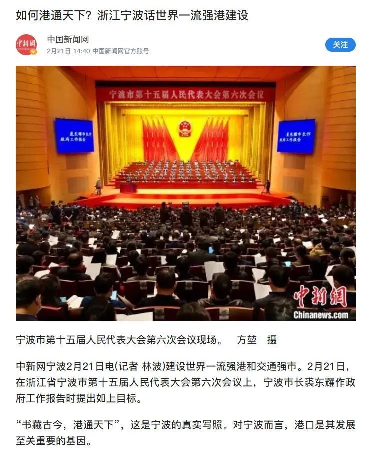 2月21日,中国新闻网刊发《如何港通天下?浙江宁波话世界一流强港建设》文章,关注宁波市第十五届人民代表大会第六次会议谋划推动宁波舟山港打造世界一流强港。