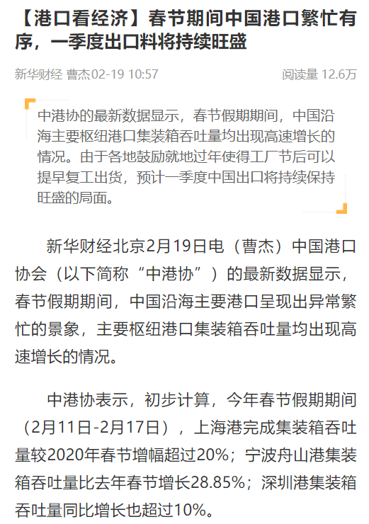 2月19日,新华网外文频道和新华财经分别刊发《Chinese ports receive more cargo over Spring Festival amid economic recovery》《春节期间中国港口繁忙有序,一季度出口料将持续旺盛》,报道了宁波舟山港等港口春节期间保持增长态势。