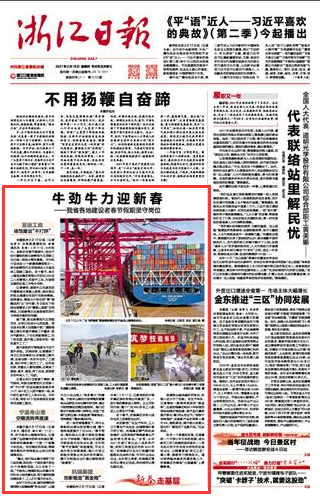 2月18日,《浙江日报》在头版醒目位置刊发报道《牛劲牛力迎新春——我省各地建设者春节假期坚守岗位》,聚焦宁波舟山港多举措加快空箱流转,确保春节期间物流链畅通的相关情况。
