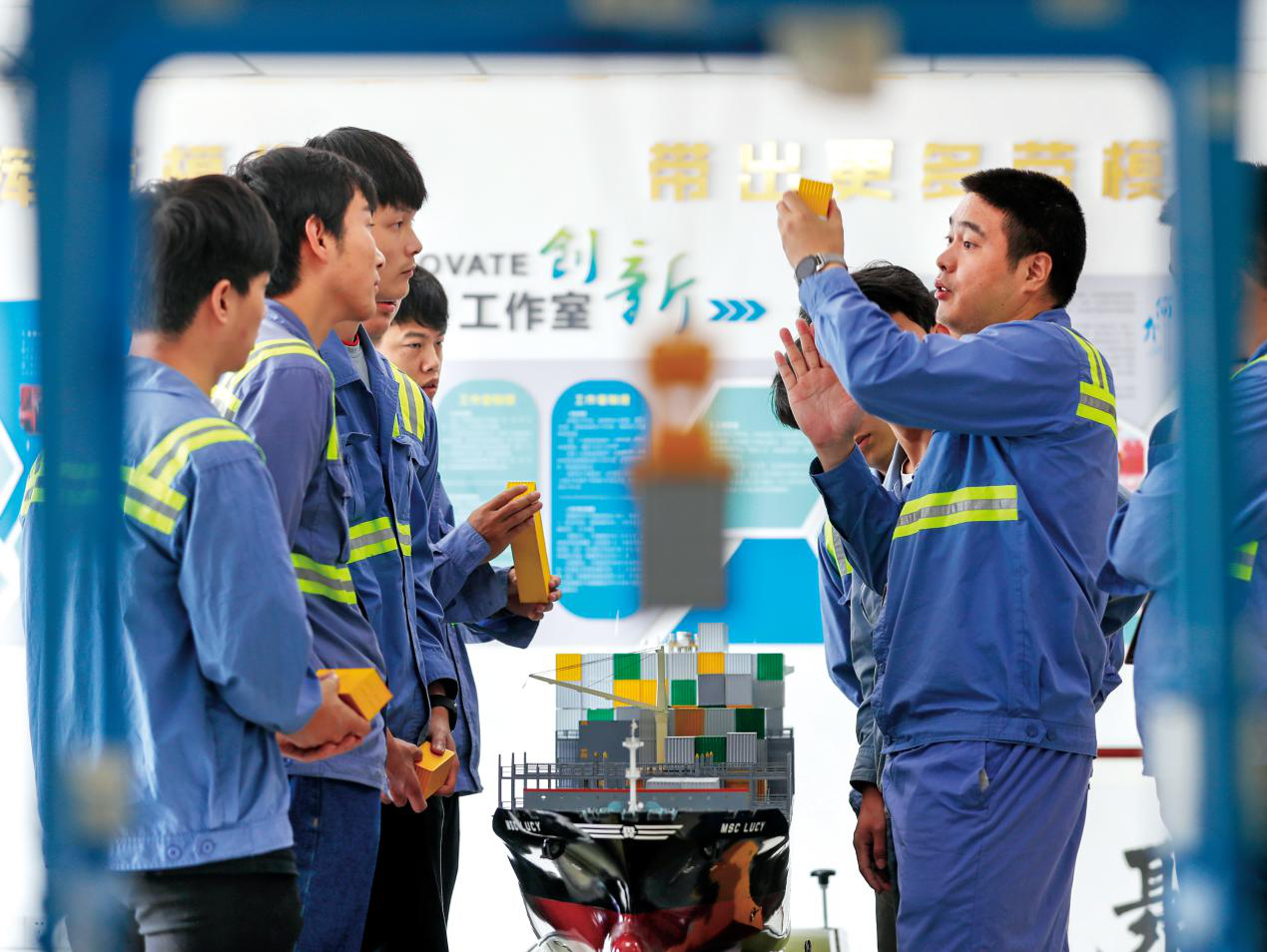图为大国工匠竺士杰(右二)正在分享“竺士杰桥吊操作法”