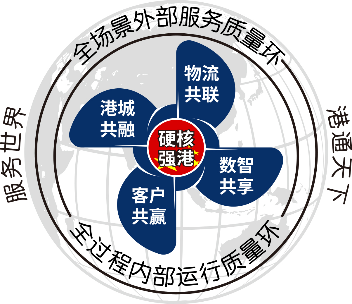 “四共”即通过以“货物”为根本的物流共联,提供高效全面的枢纽型服务;通过以“信息”为媒介的数智共享,提供精密安全的智慧型服务;通过以“需求”为导向的客户共赢,提供特色便捷的魅力型服务;通过以“融合”为路径的港城共融,提供生态和谐的可持续型服务。