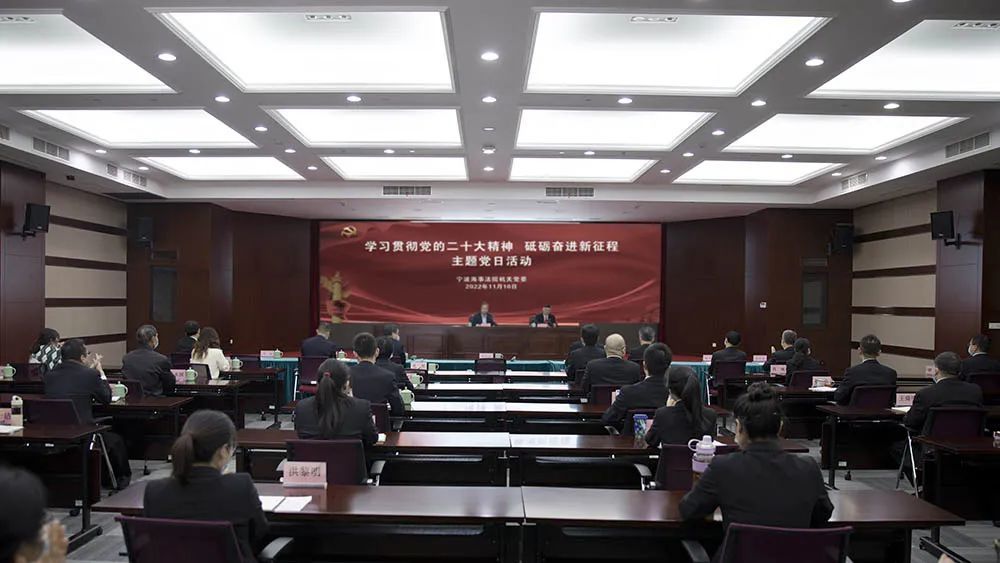 11月10日下午,宁波海事法院开展“学习贯彻党的二十大精神 砥砺奋进新征程”主题党日活动。党的二十大代表,浙江省海港集团、宁波舟山港集团党委书记、董事长毛剑宏受邀为全院干警宣讲党的二十大精神。宁波海事法院党组书记、院长唐学兵主持活动,全院干警参加。