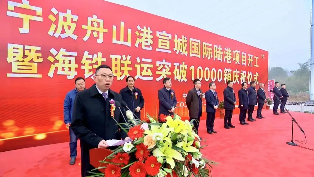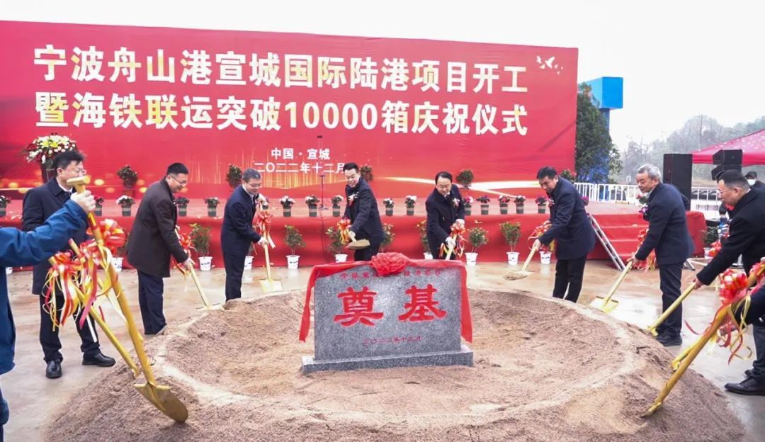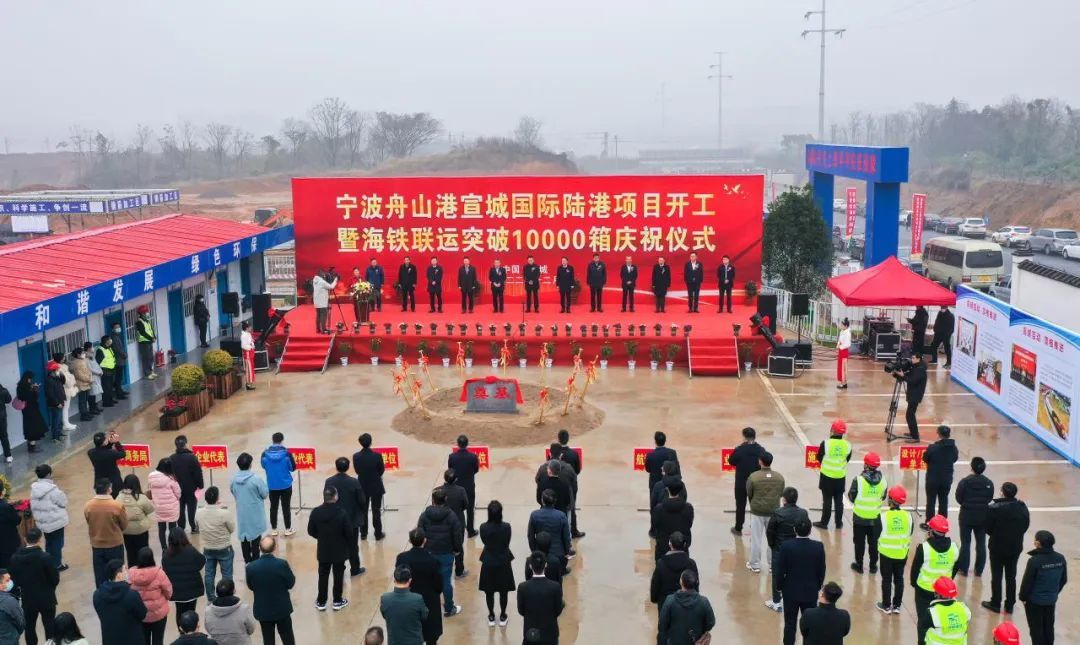 12月9日上午,宁波舟山港宣城国际陆港项目开工暨海铁联运突破10000箱庆祝仪式在安徽省宣城市举行。