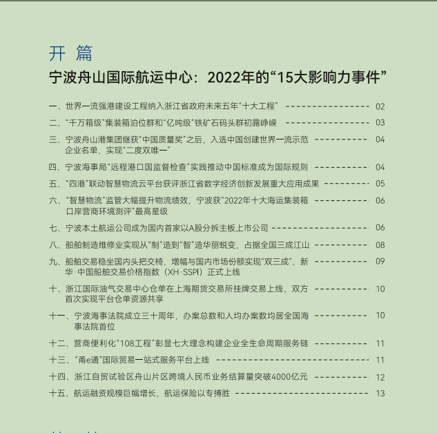 蓝皮书“开篇”集中展示了2022年“世界一流强港建设工程纳入浙江省政府未来五年‘十大工程’”“‘千万箱级’集装箱泊位群和‘亿吨级’铁矿石码头群初露峥嵘”“船舶交易稳坐国内头把交椅,新华·中国船舶交易价格指数(XH·SSPI)正式上线”“营商便利化‘108工程’彰显七大理念构建企业全生命周期服务链”等“15大影响力事件”。蓝皮书主体篇章包括“海港枢纽及集疏运体系建设与发展”“航运服务功能体系建设与发展”“航运营商软环境建设与发展”等。