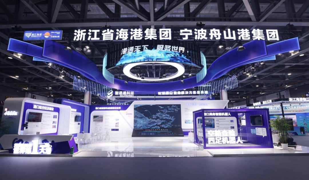 本届博览会上,集团展位全面呈现了集团建设世界一流强港的最新成果。展位通过数字沙盘实时展示宁波舟山港集装箱吞吐量动态,并重点呈现空箱查验机器狗、空箱捆扎机械臂等具身智能机器人实景作业场景。