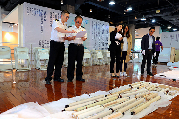 图为:广州海关隶属南沙海关关员在粤港澳大湾区名家书画展开展前进行现场监管