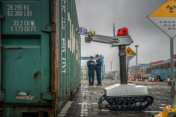图为:宁波海关查验关员使用机器人开展放射性人工排查