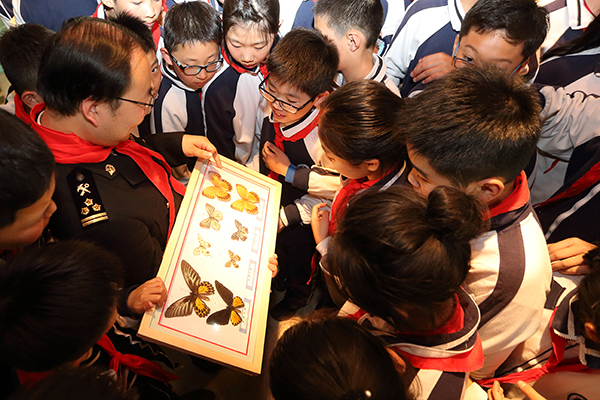 图为:海关关员为学生讲解标本制作知识