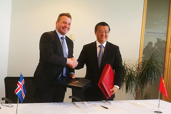 图为:倪岳峰与冰岛外交外贸部长格维兹勒于尔·索尔·索尔达松签署文件