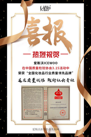 爱斯沃一直秉承重视质量、严把质量的精神,全部产品都在国家食药监局进行了备案,每年都会对所有运营的产品进行梳理和升级,就是要给国人一个健康美丽时尚的产品和服务。在中国质量检验协会组织开展的2019年“3.15”“产品和服务质量诚信承诺”主题活动中,爱斯沃品牌获“全国化妆品行业质量领先品牌”殊荣,爱斯沃的运营主体公司-北京易通华创国际企业管理有限公司被授予“全国产品和服务质量诚信示范企业”、“全国化妆品行业质量领先企业”荣誉称号,在此基础上爱斯沃再次荣获“全国百佳质量诚信标杆企业”。荣誉意味着责任,相信爱斯沃会在社会各界的关心和支持下,得到更健康、更持续的发展,为做中国优秀的国货精品而奋斗!