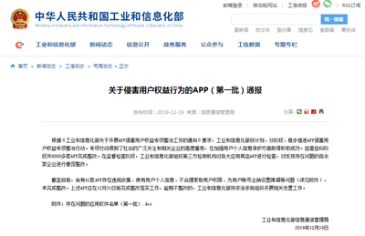 12月19日,工信部官网通报第一批侵害用户权益行为的APP。根据《工业和信息化部关于开展APP侵害用户权益专项整治工作的通知》要求,工业和信息化部按计划、分阶段、稳步推进APP侵害用户权益专项整治行动。专项行动得到了社会的广泛关注和相关企业的高度重视,在加强用户个人信息保护方面取得积极成效。自查自纠阶段共8000多款APP完成整改。在监督检查阶段,工业和信息化部组织第三方检测机构对各大应用商店APP进行检查,对发现存在问题的百余家企业进行督促整改。