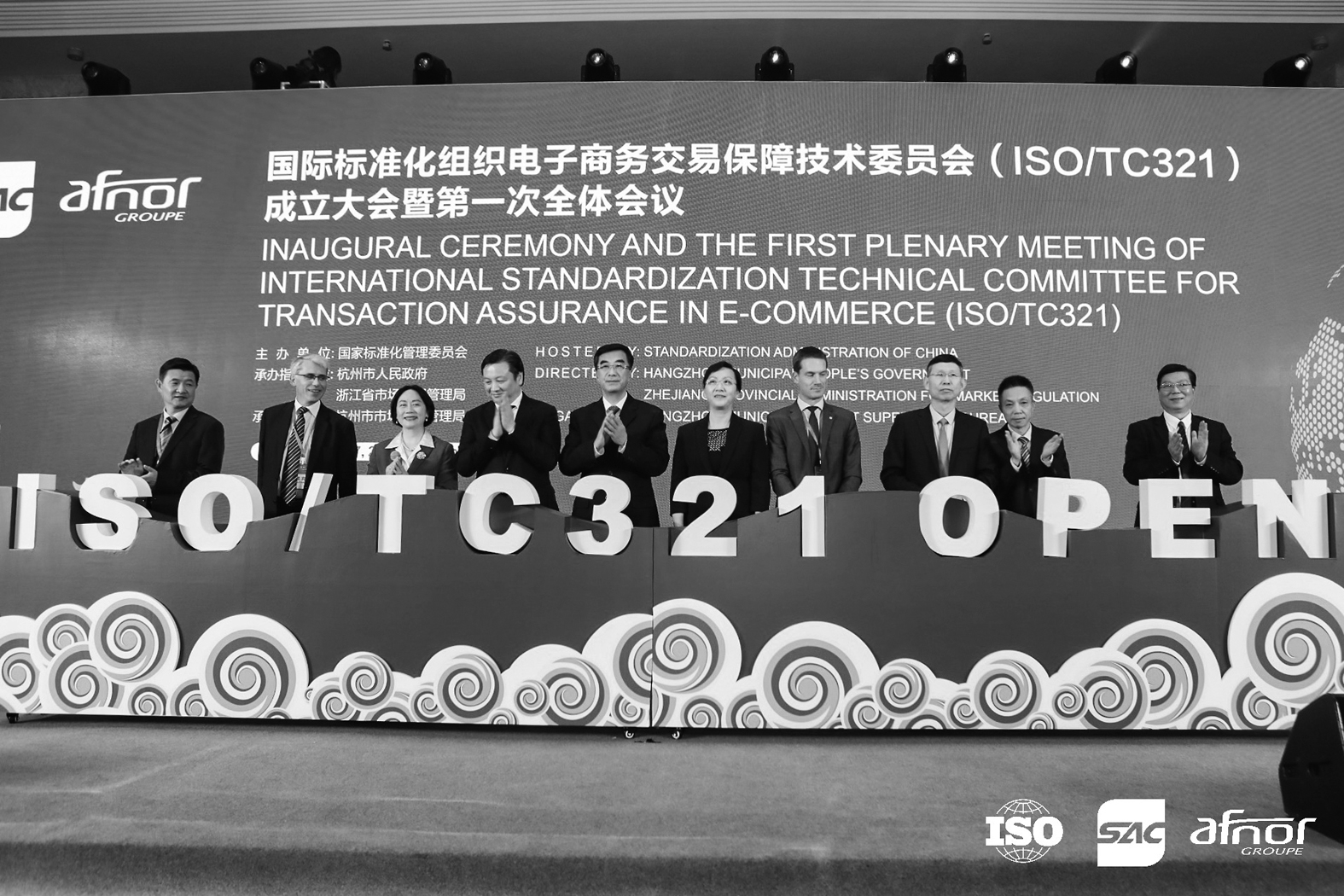 2019年11月5日,由杭州国家电子商务产品质量监测处置中心承担秘书处工作的国际标准化组织电子商务交易保障技术委员会(ISO/TC321)在杭州正式成立,这是我国电商领域设立的第一个国际性标准化技术委员会。图为成立大会现场。