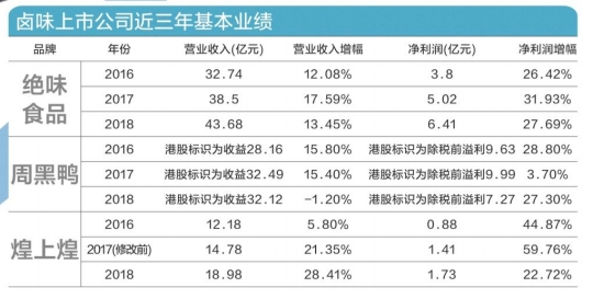 南都记者查阅年报发现,三家卤味上市公司中,2018年营收额最高的是绝味食品,最低的则是老牌卤味上市企业———煌上煌,两家公司营收均出现双位数增长,仅周黑鸭营收出现- 1 .20%增长,而这是周黑鸭上市以来首次出现营收增速放缓。